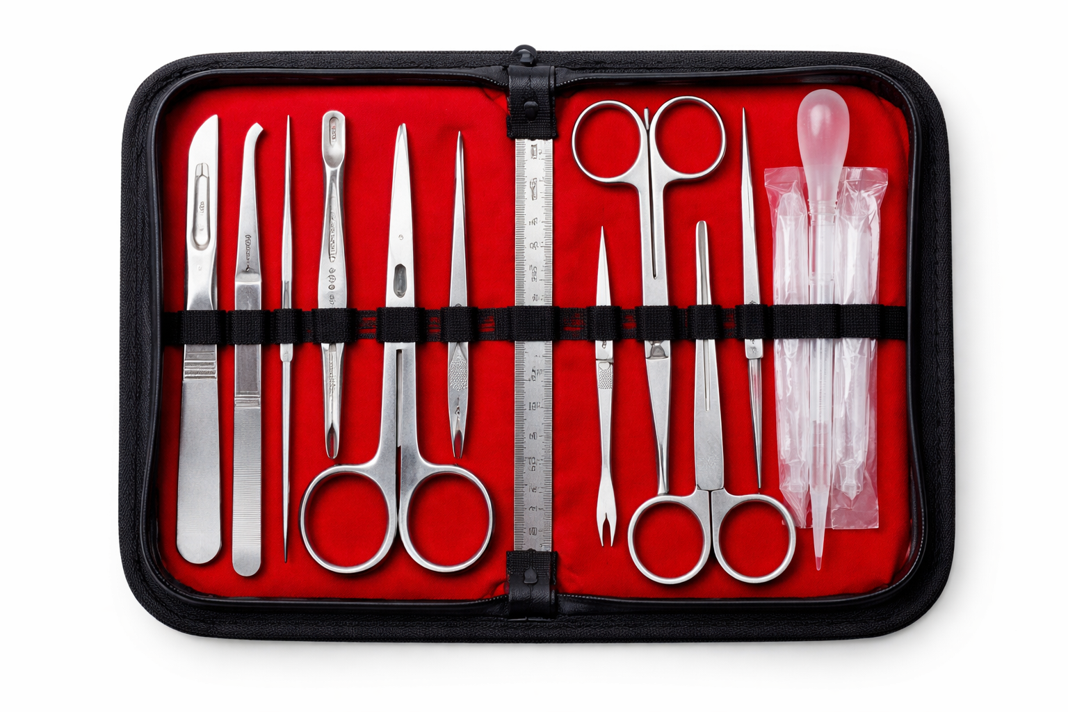 Most standard dissection kits come neatly arranged in a portable zippered case for easy storage and transport. The instruments are typically made from stainless steel, making them durable, rust-resistant, and easy to sterilize after use.
